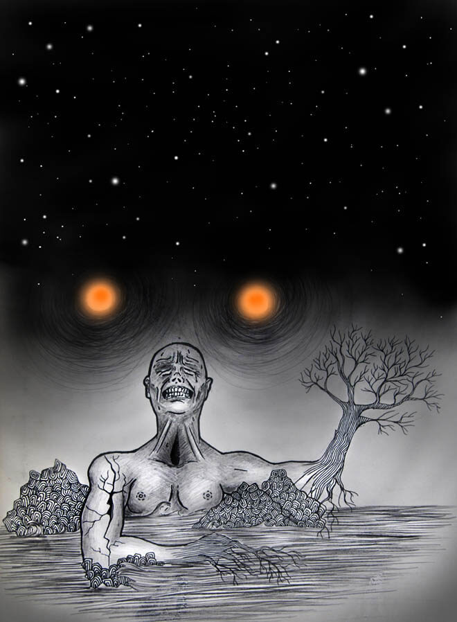 Vracel se pokaždé, když zemřel. Roztrhal se, shořel, obrostl lesy a skalami, rozpustil se v oceán… nezáleželo na tom. Někdy byl víc, než dřív, jindy byl sotva stínem minulé velikosti. Vždy zpíval o tom, co viděl po odchodu mezi Den a Den. Zapomínal. Ten zamotaný uzel nezačal na Zemi, a pokud ano, pak jsou pamětníci milénia prachem. Opakující se kroky v uroboru nekonečného zatracení, a do toho teskná hudba flétny a pár úderů zvonů.