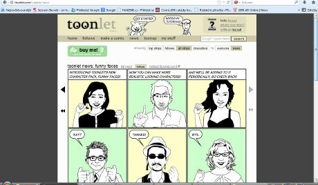 Toonlet je trochu složitější a rozmanitější aplikace. Autor stránek přidal na youtube dvě tutorial videa, která mají něco přes dvanáct minut. Můžete si zde vytvořit avatara a komiksové stripy a vytvářet tak svou postavu, měnit účesy, tvar nosu a podobně. Tvořit stripy lze však pouze černobíle s možností přidání barevné pozadí. Své výtvory také můžete sdílet na sociálních sítích, musíte si však založit účet.