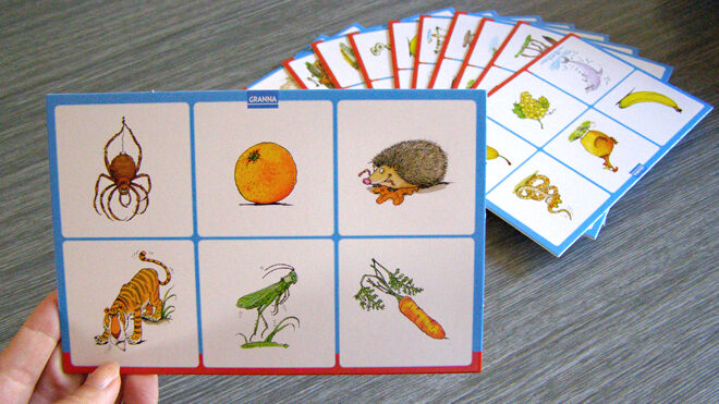Jen obrázky k učení jazyka nestačí, ale jimi to také nekončí. Každou kresbu doplňuje text, a to vždy na druhé straně karet a hracích ploch. Tyto dvě části hry z papíru a kartonu, plus ještě malé modré žetony, bohatě k partii postačují. Soupeři vždy dostanou jednu z dvanácti hracích ploch se šesti různými symboly a nadále sledují, jestli se objevuje totéž jídlo či zvířata i na postupně vykládaných kartách. Za každou rozpoznanou shodu pokládají na svou plochu žeton, přičemž vyhrává ten, kdo jako první zaplní všech šest polí.