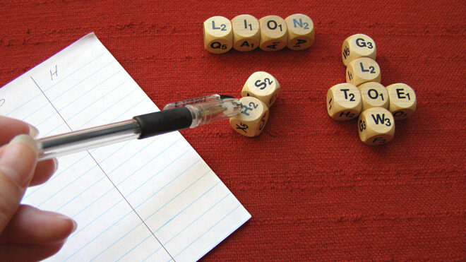 I zde neběží o nic jiného, než o skládání slov z písmen padnutých na kostkách. Hráči přitom mají celkem široké pole působnosti. Mohou si vybrat, jestli pokládat slova zvlášť, a nebo je napojovat na sebe a tvořit křížovky. Také se nemusí omezovat pouze na podstatná jména. Povolené jsou i další slovní druhy, a to i různě vyskloňované či vyčasované. Přísnější pravidla by zbytečně mařila účel hry. Angličtina se jistě procvičí mnohem lépe, využije-li se maximum z možností.