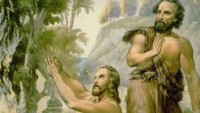 Po kratším seznámení s rodiči, tedy epizodou samotného ráje, začíná jednoho krásného dne příběh zápalnou obětí. Kain, navýsost oddaný Bohu, postává nevěřícně u své oběti a s lítostí v očích hledí na oběť bratrovu. Podle vzhledu kouře z obětišť má Bůh bratra evidentně radši. Čímž Ábelovi zajistil, že jej bratr nezahrne sourozeneckou láskou, ale hlínou. Následně sestoupí Nejvyšší ze své výše, označí Kaina znamením a odkáže jej k věčnému bloudění, ba co víc, škodolibě mu slíbí, že nezemře, aby se snad ze svého údělu nevyvlékl příliš předčasně.