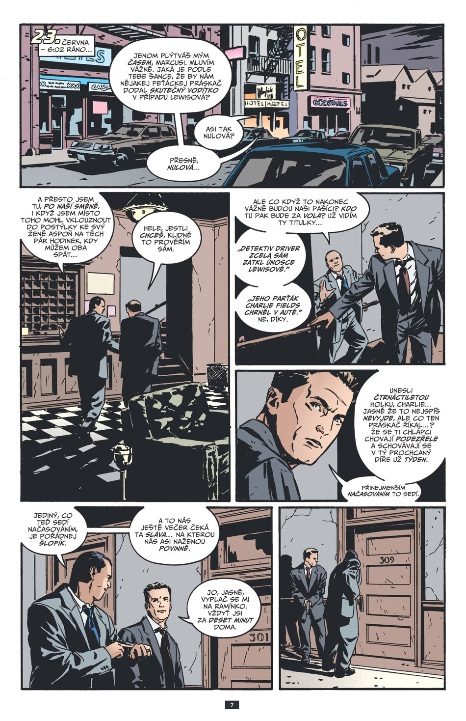 Michael Lark: Gotham Central #1Příběhy působí civilně (sakra, slibuju, že už tohle slovo dneska nepoužiju) a hlavně lidsky. Reálně. Postavy se chovají rozumně, mají opravdové osobnosti, a celý svět šlape v logické návaznosti. Bez náhlých osvícení a podobných hloupostí.