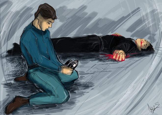 „Rychle, hoďte mi ten startér, ať ho můžu konečně zničit,“ řekl Barns omámeným, ale přesto klidným tónem. Michael zvedl přístroj ze země, když si všiml, že v druhé díře leží v kaluži krve postava v černém obleku.