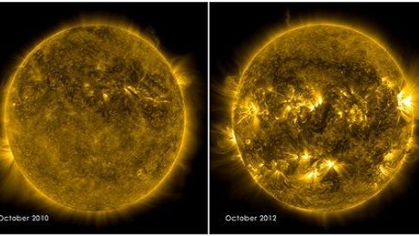 Na snímku je jasně patrný rozdíl mezi slunečním zářením z roku 2010 a 2012. Porovnáván je měsíc říjen. Slunce se blíží k vrcholu aktivity, která vyvrcholí v příštím roce. Naše mateřská hvězda prochází tzv. slunečními cykly přibližně každých 11 let.