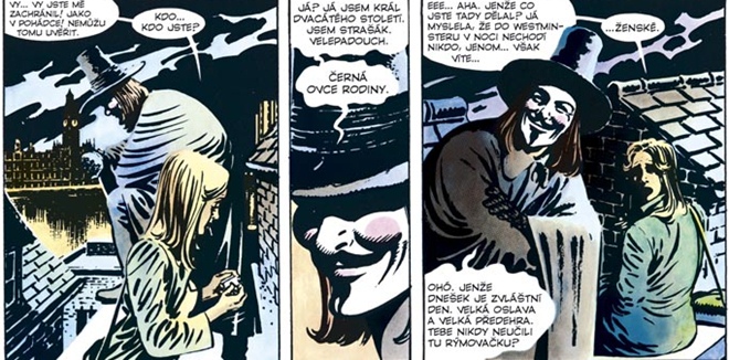 Už samotná hlavní postava slouží tomuto účelu. Původní návrh byl jakýmsi transsexuálním teroristou. Ne. Poté superhrdinský policista. Ještě horší. S konečným návrhem přišel výtvarník, David Lloyd. Co z hrdiny příběhu vytvořit reinkarnaci Guye Fawkese (atentátník stojící za Spiknutím střelného prachu v roce 1605)? Každý pátý listopad se v Anglii oslavuje jeho zatčení, nemělo by se však smutnit? Hlavní postava komiksu, tajemný V, se tak skrývá za jeho maskou a nakonec i dokonává jeho pokus vyhodit do vzduchu parlament.