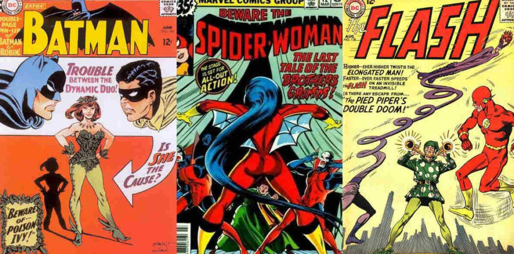 Ukázky obálek komiksových sešitů. Kresba Carmine Infantino.